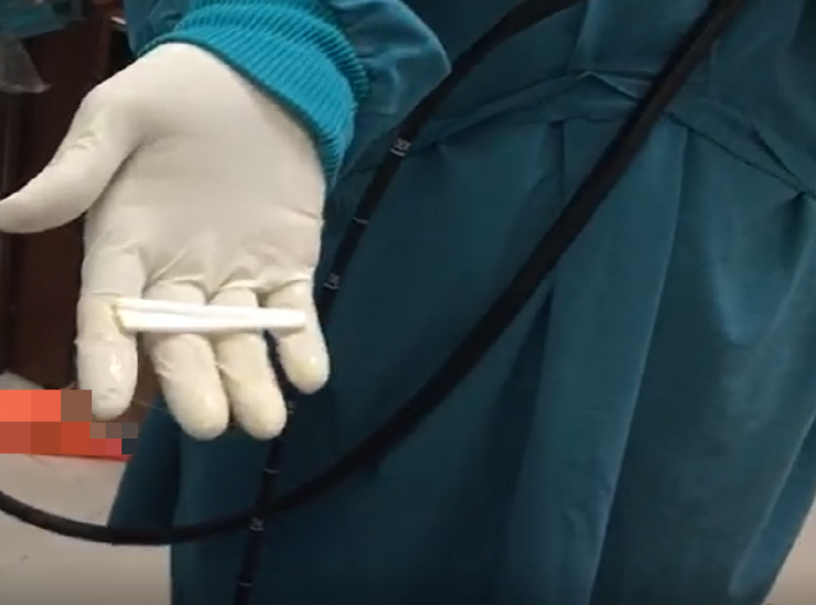 Bác sĩ nội soi thực hiện gỡ bỏ một bên rồi xoay dọc dị vật, dùng chụp dị vật sau đó lấy kìm cá sấu kéo dị vật ra ngoài. Dị vật là phần cán bàn chải đánh răng người bệnh tự nuốt.