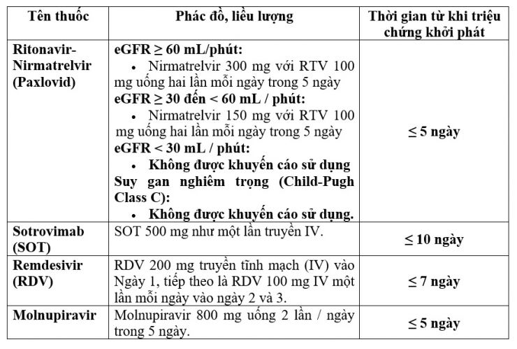 Bảng. Chế độ liều lượng cho các loại thuốc được khuyến cáo cho người lớn nhiễm Covid-19 có nguy cơ cao, không nhập viện mức độ từ nhẹ đến trung bình, được liệt kê theo thứ tự ưu tiên dựa trên hiệu quả và sự tiện lợi khi sử dụng.