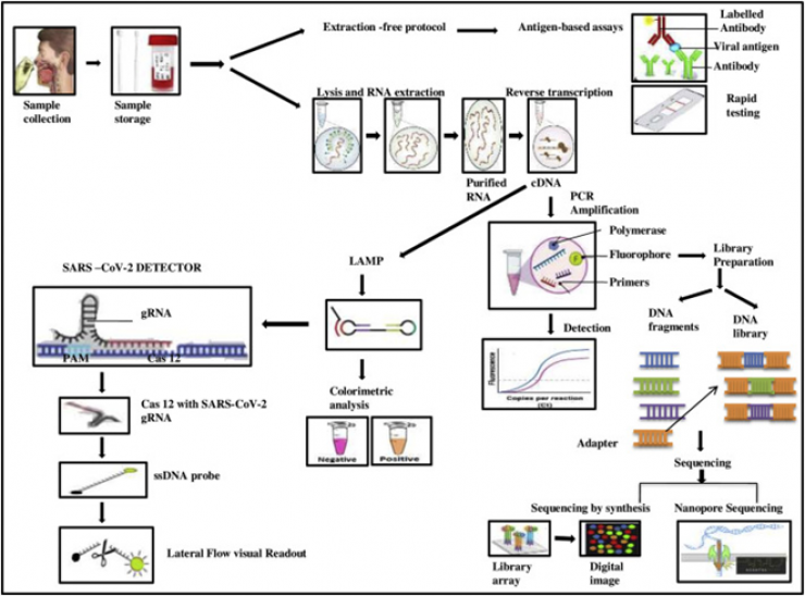 Xét nghiệm được sử dụng phổ biến và đáng tin cậy nhất để chẩn đoán Covid-19 là xét nghiệm RT-PCR và xét nghiệm test nhanh kháng nguyên SARS-CoV-2. Mẫu bệnh phẩm được thực hiện bằng tăm bông ngoáy dịch ở tỵ hầu hoặc gần đây là dịch nước bọt. Các nhà sản xuất khác nhau sử dụng nhiều mục tiêu gen RNA của vi-rút SARS-CoV2 nhưng thường dùng một hay hai gen. Các gen bao gồm ORF1ab, RdRp, E, N và S là các mục tiêu được sử dụng thường xuyên nhất để phát hiện SARS-CoV-2.