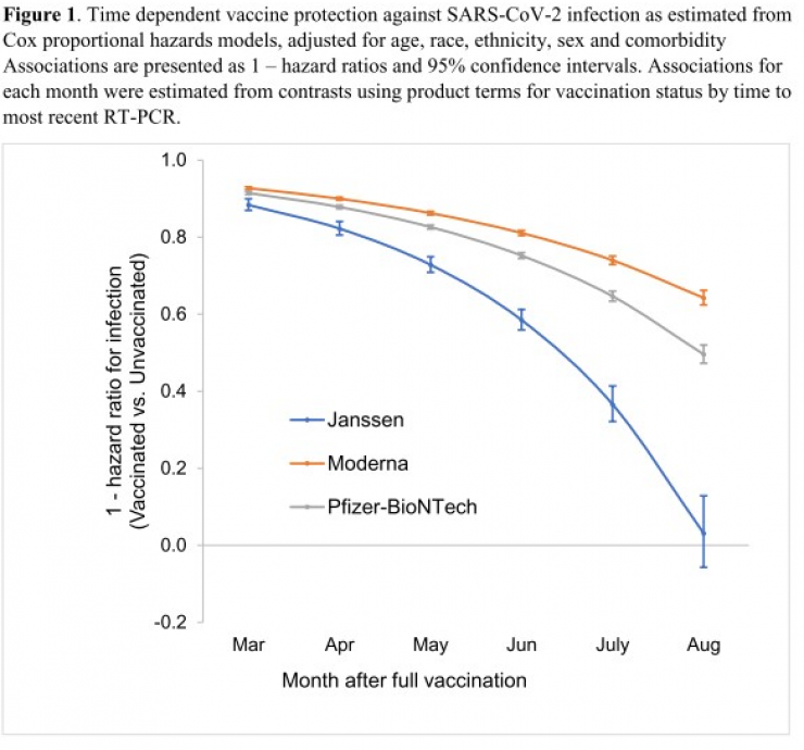 Vi-rút SARS-CoV-2 đã gây “nhiễm khuẩn đột phá” cho gần 620.000 cựu chiến binh, đây là một con số khá lớn. Nhóm nghiên cứu đã so sánh tình trạng nhiễm Covid-19 và tình trạng tiêm chủng vắc-xin. Họ đã đưa vào mẫu nghiên cứu những người có xét nghiệm RT-PCR dương tính với SARS-COV-2, so sánh với tình trạng tiêm vắc-xin của họ và xem có bao nhiêu người mắc bệnh có triệu chứng. Bài báo này không nói về tình trạng bệnh nặng phải nhập viện và tử vong nên đó là hạn chế quan trọng. Nhưng có một kết luận khá kinh ngạc là khi so sánh tình trạng nhiễm SARS-COV-2 theo tình trạng tiêm chủng từ 01/02/2021 đến 13/08/2021 trong nhóm những người thuộc Cơ quan Quản lý Y tế Cựu chiến binh (VHA), chiếm 2,7% dân số Hoa Kỳ thì tỷ lệ bảo vệ bằng vắc-xin giảm từ 91,9% trong tháng 3 xuống còn 53,9% vào giữa tháng 8 năm 2021 (p <0,01, n = 619.755). Sự sụt giảm nhiều nhất đối với vắc-xin Johnson & Johnson, sau đó là Pfizer - BioNTech và Moderna. Như vậy trong vòng chưa đầy 6 tháng, hiệu quả của vắc-xin ở những người đã tiêm đủ 2 mũi giảm 38%. Khi phân tích kết quả sâu hơn về tỉ lệ bảo vệ của từng loại vắc-xin, nhóm nghiên cứu nhận thấy: