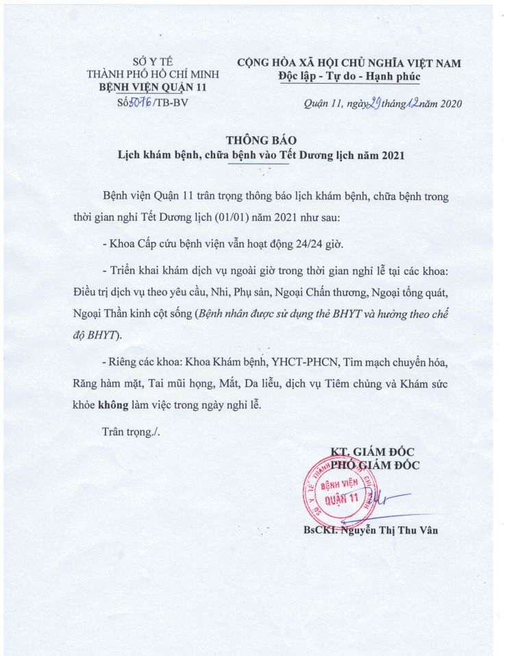 Thông báo lịch khám bệnh, chữa bệnh Tết Dương lịch năm 2021