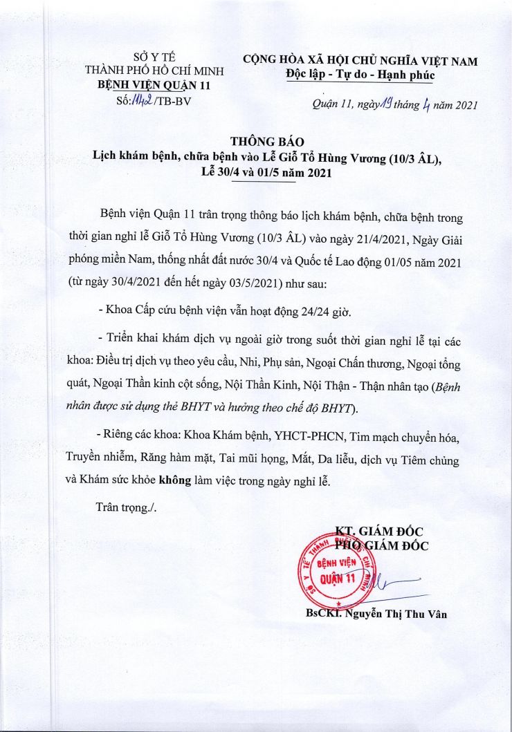 Thông báo lịch khám bệnh, chữa bệnh vào Lễ 30/4 và 01/5 năm 2021