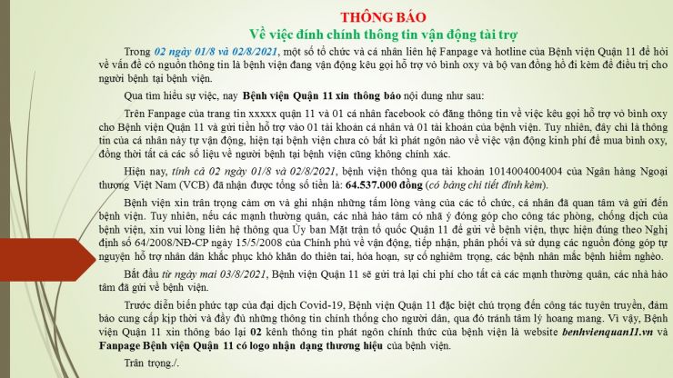 Thông báo về việc đính chính thông tin vận động tài trợ