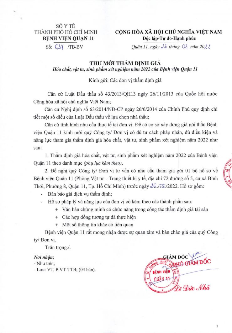 Thư mời thẩm định giá hóa chất, vật tư, sinh phẩm xét nghiệm năm 2022 của Bệnh viện Quận 11