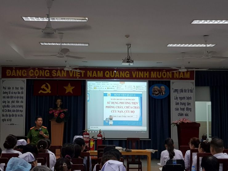 Thực hiện Kế hoạch số 2258/KH-BV ngày 01/7/2019, nhằm phổ biến, nâng cao nhận thức trách nhiệm và trang bị kiến thức cơ bản cho viên chức, người lao động làm việc tại bệnh viện về việc thực hiện nhiệm vụ, cách sử dụng các phương tiện phòng cháy, chữa cháy, cứu nạn, cứu hộ và cách xử trí khi có sự cố xảy ra, chiều ngày 10/7 và 11/7/2019, Phòng Hành chánh quản trị phối hợp Đội Phòng cháy chữa cháy và cứu hộ cứu nạn - Công an Quận 11 tổ chức buổi tuyên truyền và hướng dẫn sử dụng phương tiện phòng cháy, chữa cháy và cứu nạn, cứu hộ.