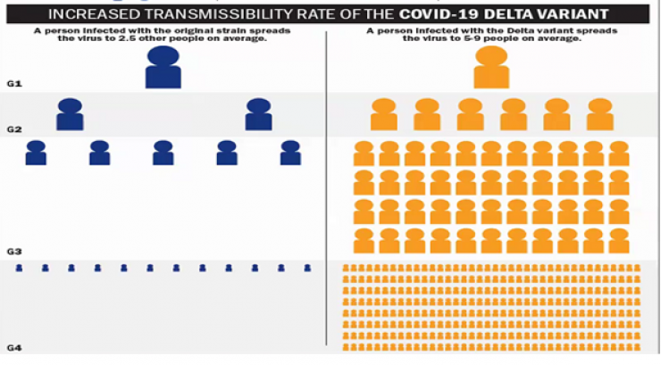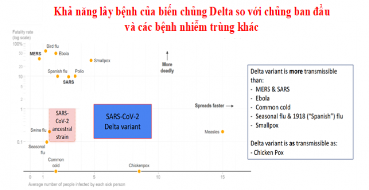 Hai hình trên cho các bạn thấy một người nhiễm chủng Alpha gây lây nhiễm cho 2,3 -2,5 người (tương tự cúm mùa), trong khi đó chủng Delta lây nhiễm cho 5-9 người (tương tự bệnh đậu mùa)